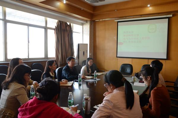 蒋乃文介绍了南师大电自院的整体情况,并就辅导员队伍建设、学生党建和学风建设等学生工作中的重点难点问题进行了交流探讨。随行的南师大电自院的学工办主任、团委书记和辅导员就学生评优评奖、团学工作、党校工作等具体工作的开展,与我院进行了深入细致的沟通。