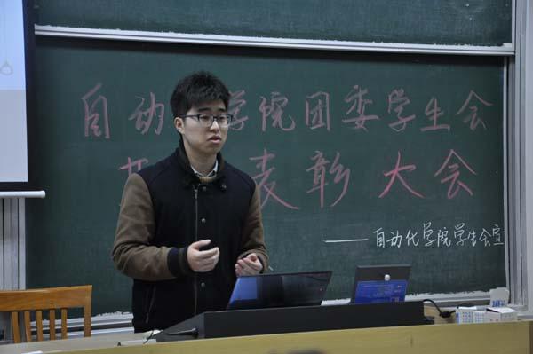 院学生会主席尤一韦首先上台发言,他对大家半年的工作和取得的成果做出肯定。他提出米兰体育 团委学生会要向服务型学生组织转型,在完成工作的同时每个人要有更多维度和更高层次的思考,不能仅停留在完成任务的层面;院团委学生会的众多部门虽然有分工和差异,但只要部门成员对各自部门的核心职能有足够的认识,就能更好的完成学生工作。最后他建议大一大二的同学在成长过程中要多读书,多和有经验的前辈们交流。