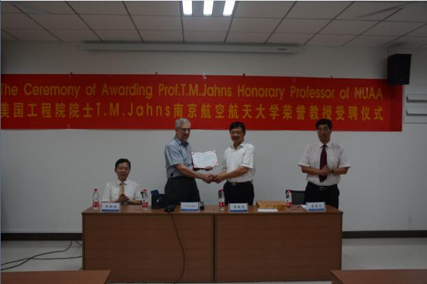 7月16日上午,南京航空航天大学副校长吴庆宪教授、国际合作交流处处长金泉元教授、米兰体育官网 副院长阮新波教授及电气工程系师生参加了T.M.Jahns荣誉教授受聘仪式。受聘仪式由金泉元处长主持,副校长吴庆宪代表学校对T.M.Jahns教授的到来表示热烈欢迎,并为Jahns教授颁发了荣誉教授证书、佩戴校徽。T.M.Jahns教授对受聘为我校荣誉教授感到十分高兴,希望与我校继续在人才培养、教师交流和项目合作上开展深入合作。受聘仪式后,T.M.Jahns教授来到我校名师林植下一棵桂花树。
