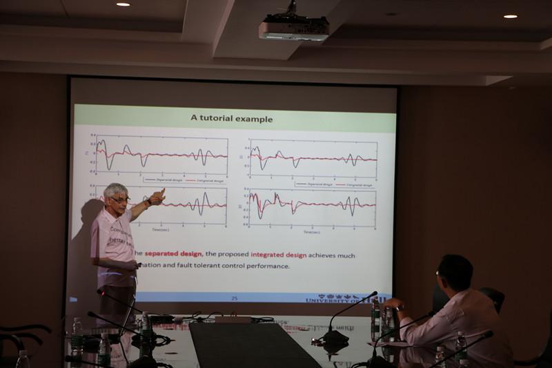 上午,Patton教授在米兰体育官网 行政楼四楼的学术报告厅作了题为“Research on Integrated design of fault estimationand FTC for uncertain systems”的学术报告。报告会由自动化院院长姜斌教授主持,自控系部分师生参加了报告会。Patton教授首先很愉快地向我们介绍了这次报告的内容,其次,详细介绍了其在容错控制方向上的一些新的研究成果。最后,Patton教授认真地解答了每位师生提出的疑问,并对课题研究前景与挑战作了展望。整场报告会从工程应用的角度极大地拓宽了我们的视野,活跃了我院的学术氛围。报告会历时一个半小时,在热烈的掌声中圆满结束。