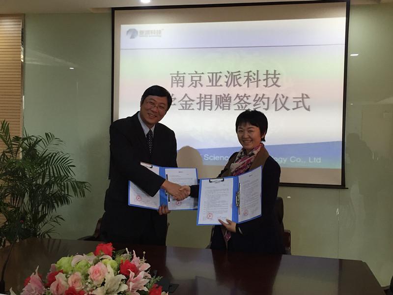 南京亚派科技股份有限公司总经理葛文海、我院党委副书记沈伯秀代表双方签订协议。南京亚派科技股份有限公司将出资20万元分5年资助米兰体育官网 电气相关专业学习成绩优异、且家庭经济困难的本科生和硕士研究生。