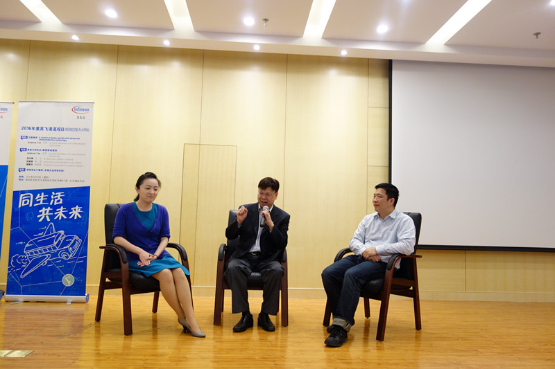 颁奖仪式后英飞凌谢国富总监作了题为”A road to a better world with advanced semiconductor technology”的技术讲座,讲述了半导体的发展历史,半导体对世界的影响以及英飞凌对社会发展做出的贡献。嘉宾讨论环节英飞凌谢国富总监、包天闻经理和我校电气系陈新老师和与会人员分享了自己学生生涯对工作的选择产生重要的影响,三位嘉宾解答了学生在就业及职业发展中的困惑。