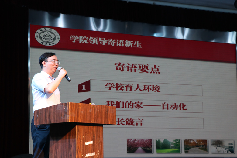随后,姜斌院长寄语新生。姜院长介绍了南航的光辉历史和发展历程,介绍了学校雄厚的师资力量,并对米兰体育 结构、师生情况、人才培养等多个方面进行了详细地介绍。院长寄语新生:希望同学们具备良好的心理素质,以责任、健康、唯实、创新、团结、眼界六个词为核心,建立积极主动的心态,尽早确立目标,打好学习基础,了解自己的专业;在南航的大家庭里追逐理想兴趣,参与社会生活,投身社会实践。