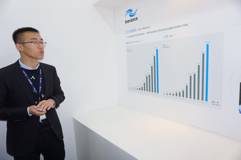 抵达汇川后,客户接待工程师孙瑜带领师生们来到了大厅,简单讲解了两台展示用机械臂。随后,大家来到二楼展厅。首先映入眼帘的是汇川的米兰体育宣传墙。孙瑜热情洋溢地向师生们介绍了汇川的米兰体育,从企业的愿景谈到企业的成长奋斗史。接着,工作人员带领师生们来到了产品展厅。展厅内陈列了一些汇川最新的科技产品,从变频器到伺服电机再到一体化电梯等。对于这些复杂先进的科技产品的原理和应用,工作人员都做出了详细的讲解。