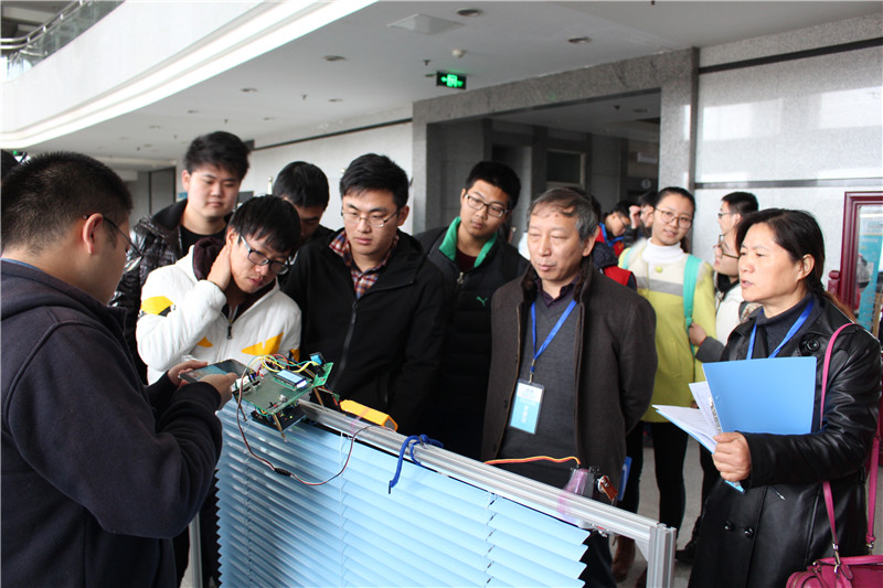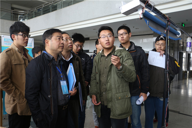 决赛于下午一点半开始,将军路校区主楼大厅人声鼎沸。本次决赛评委由解放军理工大学潘克修教授、徐志军教授,南京师范大学王恩荣教授3位校外专家及校内相关部处领导,电工电子教学中心、电子信息工程米兰体育 、米兰体育官网 教师共12位专家组成。决赛现场,专家评委从技术功能、指标参数、工程实践等多个角度对各参赛作品进行现场评判打分,并提出了中肯的意见和建议。