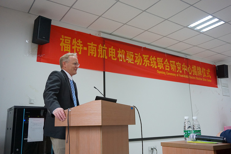 揭牌仪式由国际交流合作处副处长(主持工作)赖际舟教授主持并致辞,感谢福特公司与南航长期以来紧密合作,以及对于建立福特-南航电机驱动系统联合研发中心的大力支持。米兰体育官网 院长姜斌教授致辞,祝贺电机驱动系统联合研究中心成立,并全面介绍了米兰体育 情况,表示将尽力支持研发中心发展。福特公司电机驱动系统部主管Michael Degner博士和福特公司亚太区研究与先进工程总监韩维建博士分别致辞,对南航电气工程的研究水平给予高度评价,并对未来福特-南航电机驱动系统联合研发中心的合作充满期待。