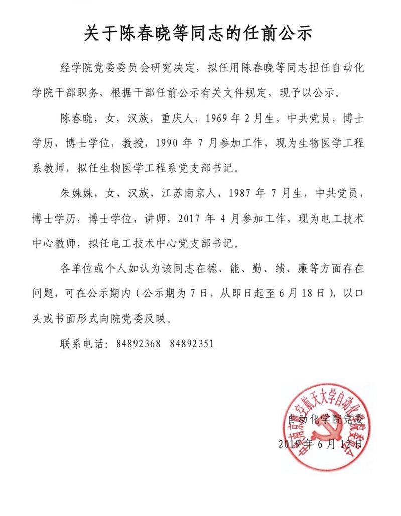 关于陈春晓等同志的任前公示