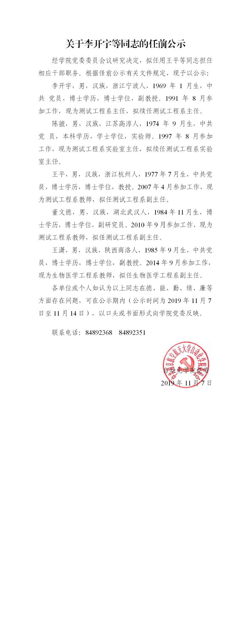 关于李开宇等同志的任前公示