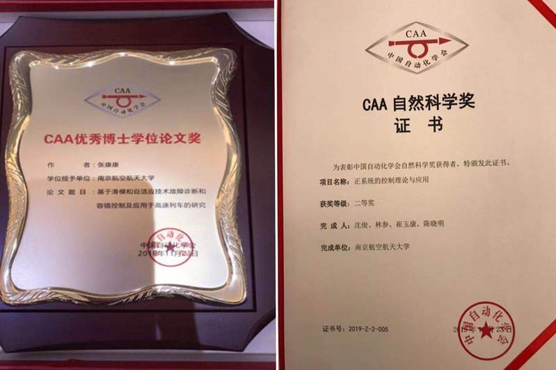 张康康博士,于2018年毕业于米兰体育-米兰体育app-米兰体育官网 ,师从姜斌教授,其博士学位论文《基于滑模技术故障诊断和容错控制及应用于高速列车的研究》获得2019年度CAA优秀博士学位论文奖。该论文深入研究了微小故障的幅值特性及演变特性,提出了微小故障的数学描述方法,为基于模型的微小故障诊断奠定了扎实的理论基础。张康康博士在读博士期间,在IEEE Trans. 等高水平期刊上共发表(录用)学术论文15篇,获工信部创新奖、国家奖学金、南京航空航天大学群星创新奖等奖励。