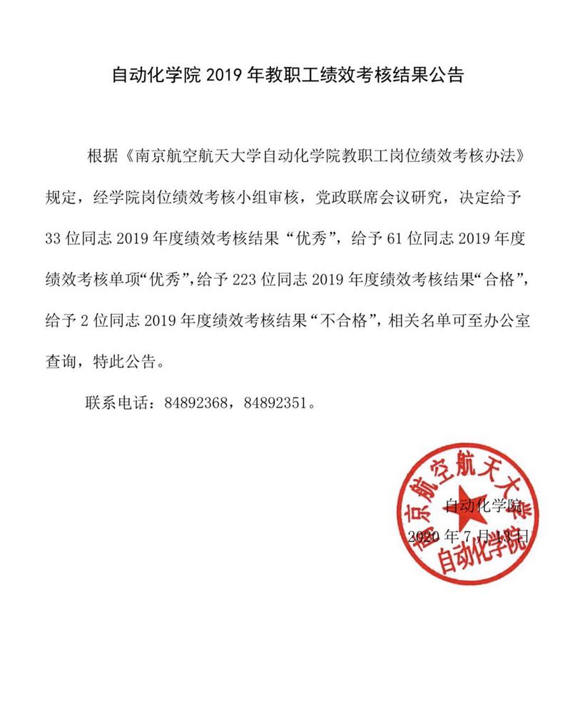 米兰体育官网 2019年教职工绩效考核结果公告