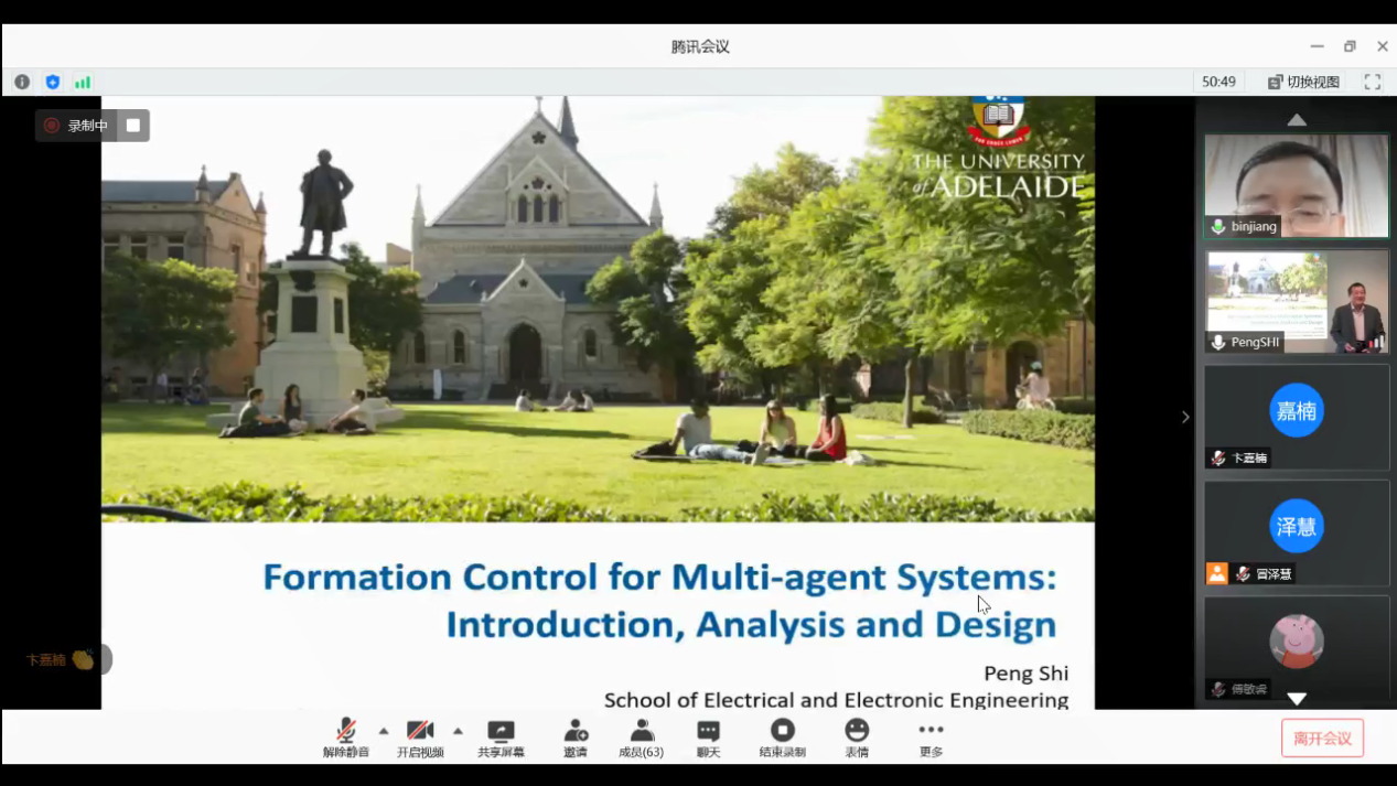 812日下午,澳大利亚阿德莱德大学电气与电子工程米兰体育 石碰教授应我校国际合作处和米兰体育官网 的邀请,通过腾讯会议作了题为“Formation Control for Multi-agent Systems:Introduction,Analysis and Design的线上学术报告,报告由我校副校长姜斌教授主持。我院副院长陈谋教授,米兰体育 陆宁云刘春生、冒泽慧、欧阳权张柯、马亚杰等师生在线参加会议。参会师生对石碰教授的交流分享表示热烈欢迎。