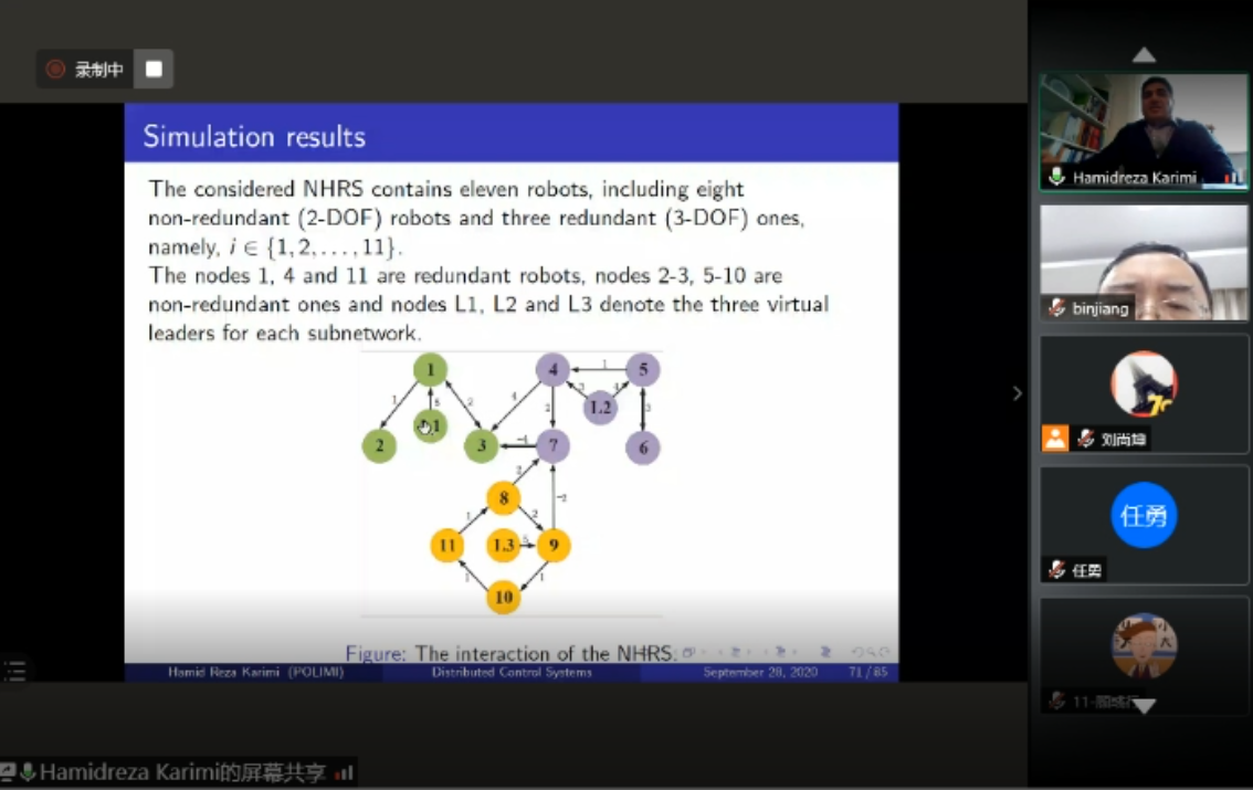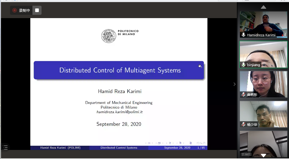 928日下午,意大利米兰理工大学Hamid Reza Karimi教授应我校国际合作处和我院的邀请,通过腾讯会议作了题为“Distributed Control of Multiagent Systems”的线上学术报告,报告由我校副校长姜斌教授主持,米兰体育 师生在线参加会议。参会师生对Hamid Reza Karimi教授的交流分享表示热烈欢迎。
