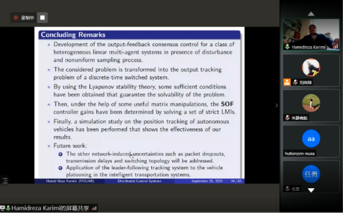 9月28日下午,意大利米兰理工大学Hamid Reza Karimi教授应我校国际合作处和我院的邀请,通过腾讯会议作了题为“Distributed Control of Multiagent Systems”的线上学术报告,报告由我校副校长姜斌教授主持,米兰体育 师生在线参加会议。参会师生对Hamid Reza Karimi教授的交流分享表示热烈欢迎。