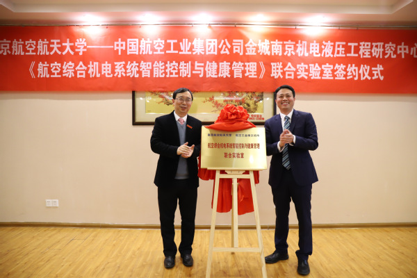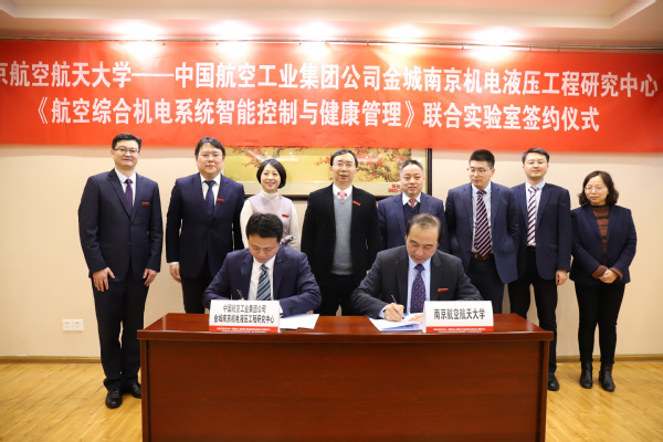 3月17日,我校与中国航空工业集团公司金城南京机电液压工程研究中心(以下简称航空工业南京机电)在将军路校区米兰体育官网 举行“航空综合机电系统智能控制与健康管理”联合实验室的签约仪式。航空工业南京机电副总经理、总工程师陈丽君,人力资源部部长王海波,液压与作动系统部部长葛益波,环控系统部部长杨昌宝;我校副校长姜斌,发展联络部部长兼党政办副主任李君,科学研究院副院长顾冬冬,米兰体育官网 党委书记李文雷,米兰体育官网 院长江驹及校企双方有关负责同志出席签约仪式。江驹和陈丽君分别代表双方签署联合实验室协议;姜斌和陈丽君为联合实验室揭牌。李文雷主持签约仪式。