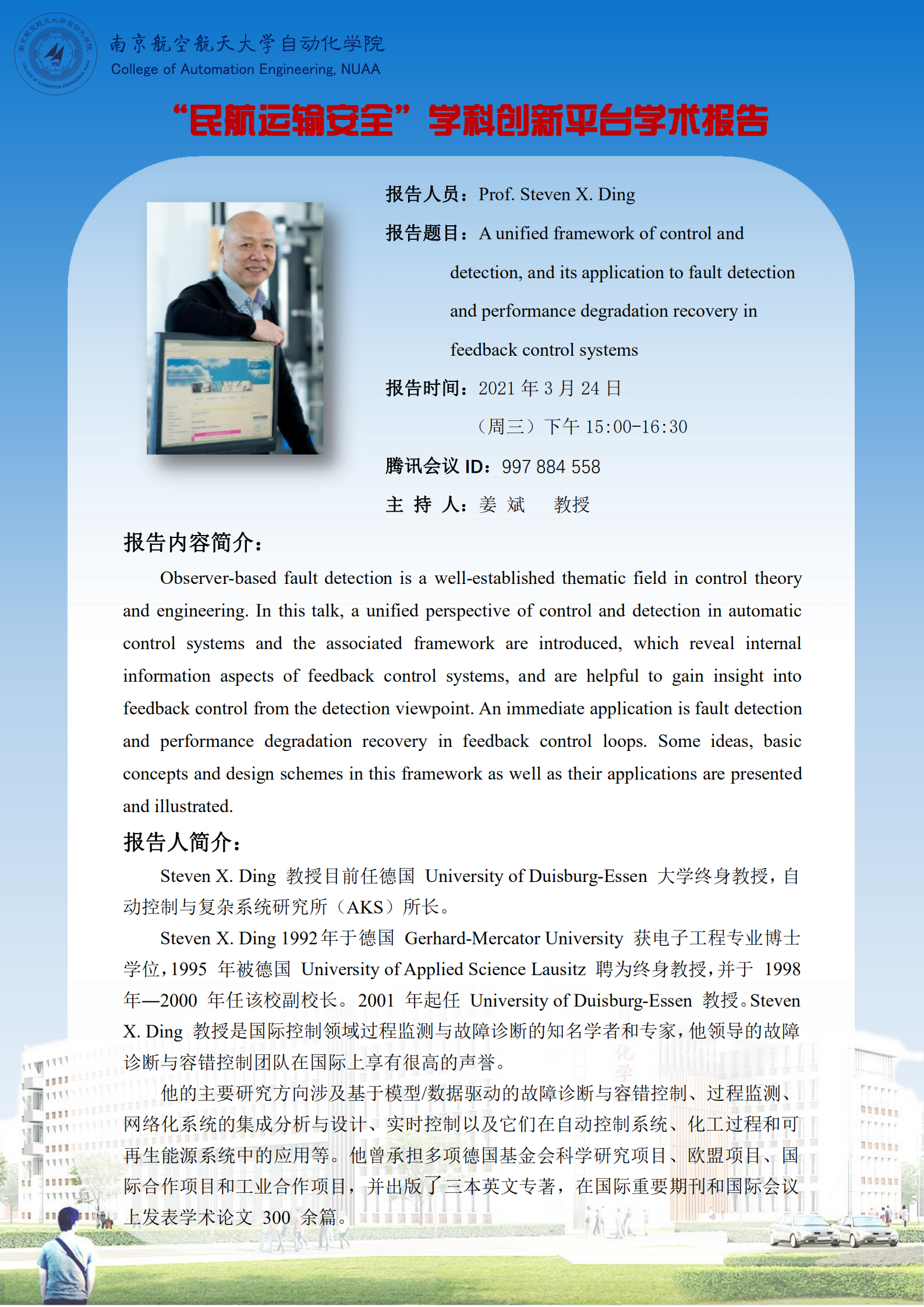 【学术报告】A unified framework of control and detection, and its application to fault detection and performance degradation recovery in feedback control systems