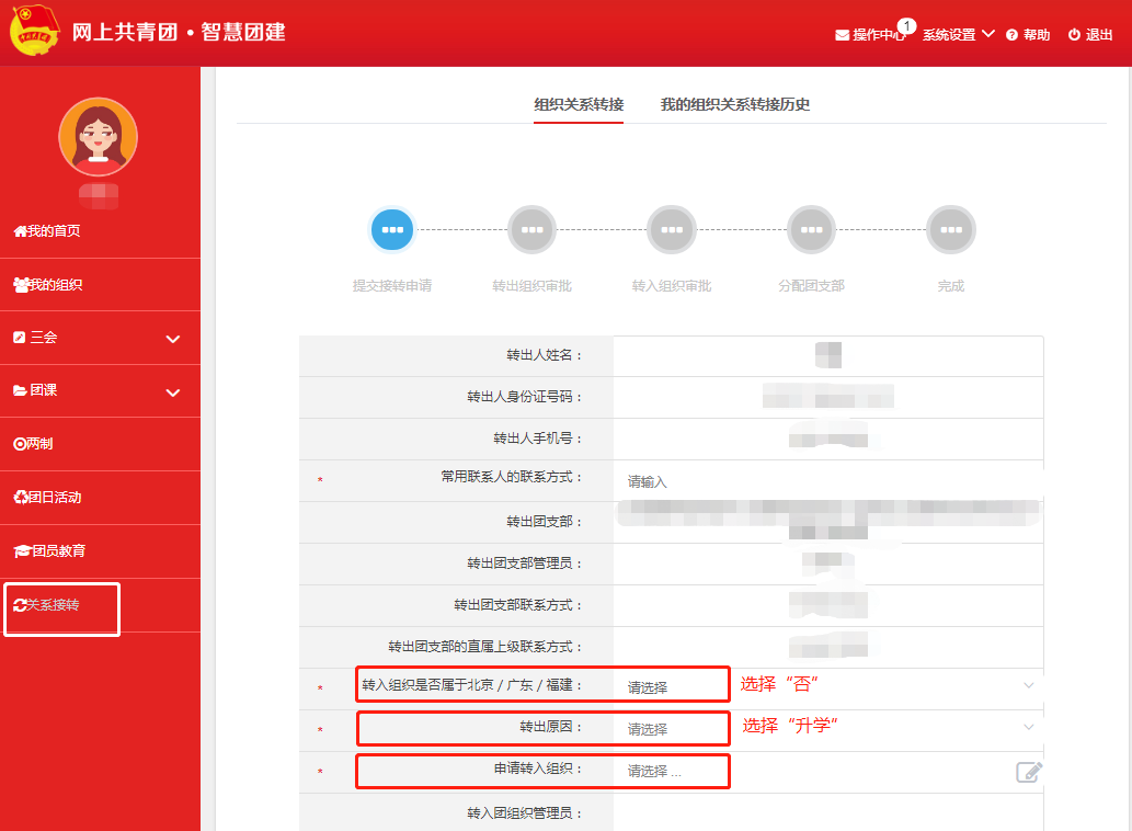 1.进入个人主页后,点击关系转接,标*的都是必填项,具体操作步骤如下图。