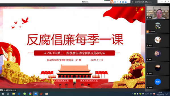 11月13日,自动控制系党支部成功开展线上主题党日活动。鉴于近期国内多地相继出现新冠肺炎本土确诊病例,支部委员会做了周密安排和准备,在落实好常态化疫情防控措施的前提下,以腾讯会议形式开展了内容丰富的主题党日活动,并邀请到校党委委员、副校长姜斌同志参会指导,支部党员参与度达到95%。