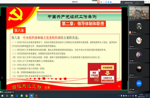 活动最后,组织委员吕品同志围绕组织工作进行了汇报,带领支部成员学习了《中国共产党组织工作条例》和加强党的建设两项内容,强调学习是坚持科学发展的必然要求,加强基层党组织队伍的学习力对基层党建具有十分重要的现实意义,是新时期坚持党领导地位的内在需要,是提高新时期党建工程经验的有效途径。