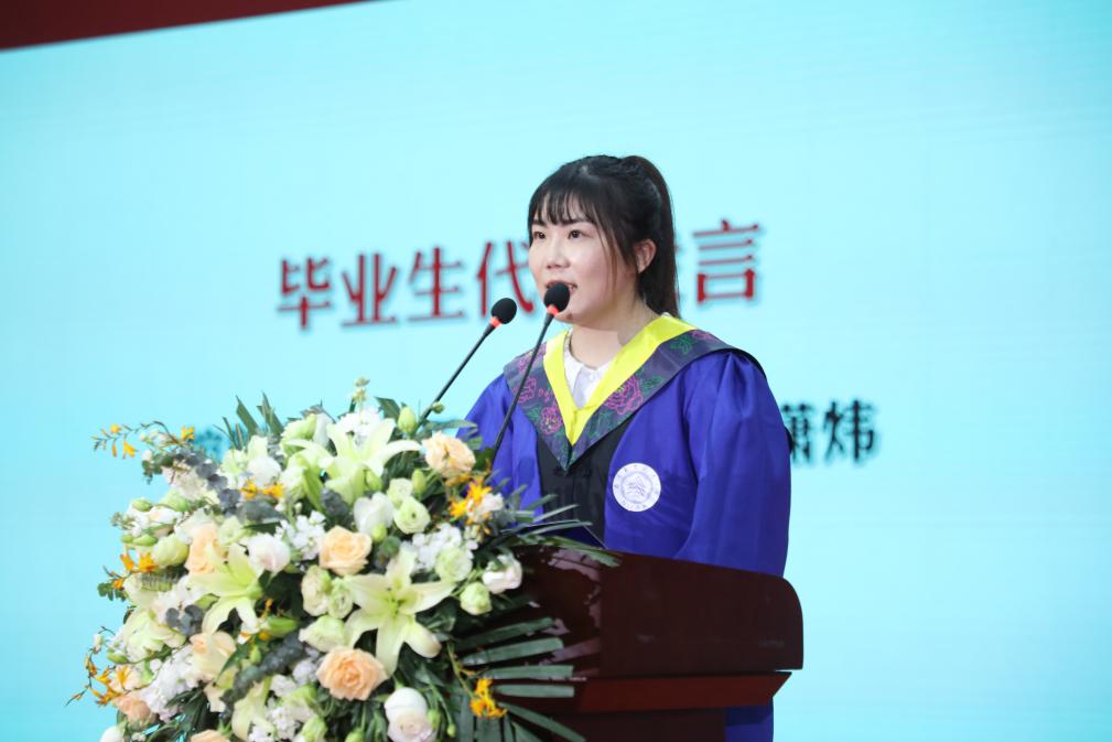 生物医学工程系钱志余教授作为教师代表发言,勉励毕业生常怀包容感恩之心,坚持勤奋学习,努力工作,不畏挑战,勇敢面对困难和未来。控制科学与工程专业瞿潇炜同学代表毕业生分享了自己的成长感悟,表达了对母校、老师和家长辛勤培育的感恩之情,表示将会继续传承报国使命,为中华民族伟大复兴贡献自己的青春、智慧和力量。教师代表、辅导员代表、学生代表为大家带来诗朗诵《感恩相遇,不负韶华》,回顾了永远难忘的师生情、同学情和三年青春年华。