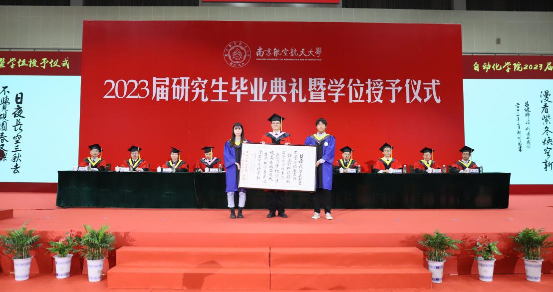 典礼上,两位毕业生代表向母院赠送集体礼物——一副吕健玮、邹可园两位同学创作的《别南航感怀》原创诗词书法作品,李文雷代表米兰体育 接受了这份来自毕业生的特殊赠礼,同时他也代表米兰体育 为毕业生代表赠送印有米兰体育 特色的纪念品,这些纪念品代表着米兰体育 希望大家牢记记格物致知,不断进德修业,志存高远,踔厉奋进,取得更高成就。