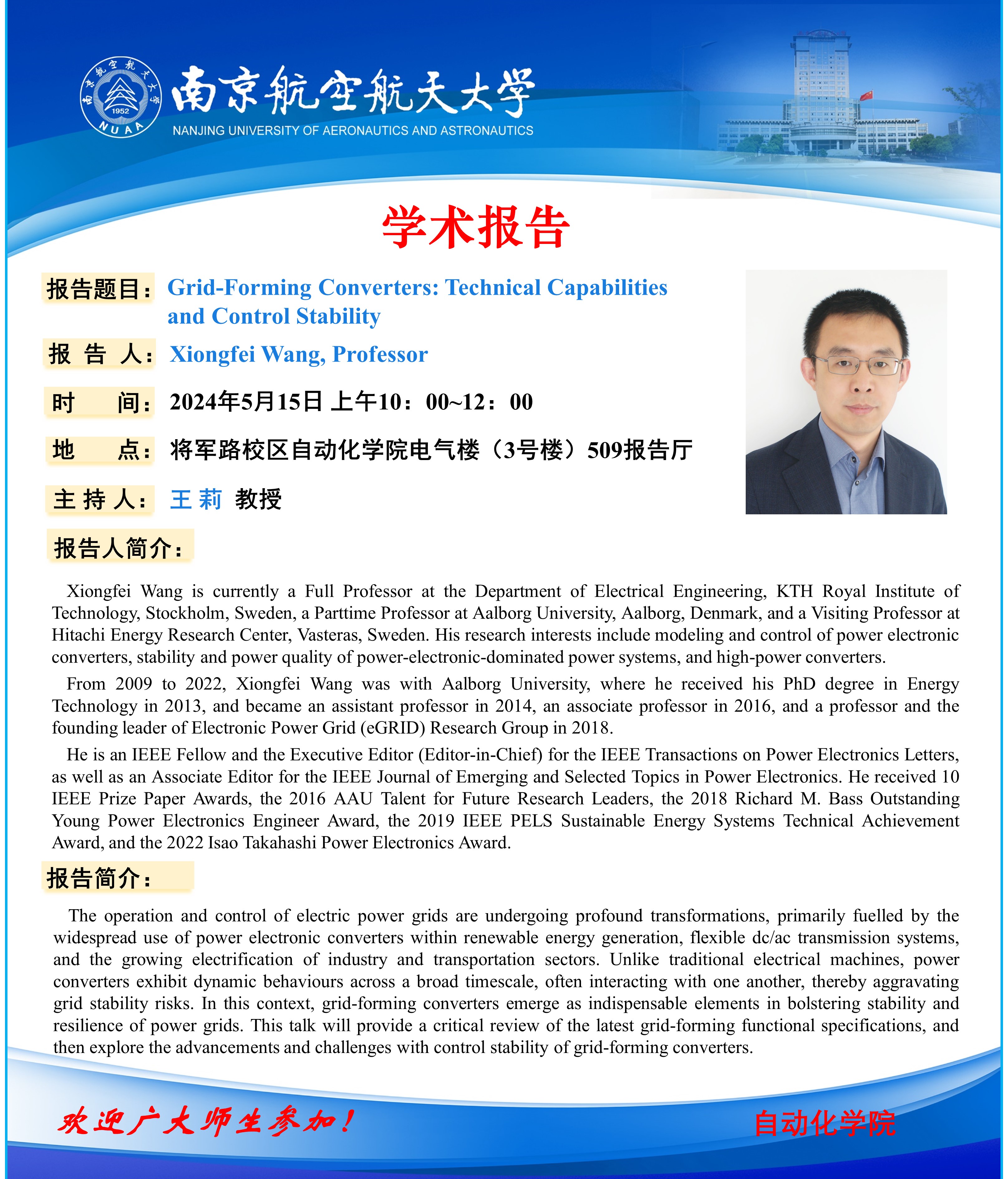 【学术报告】Xiongfei Wang:Grid-Forming Converters: Technical Capabilities and Control Stability