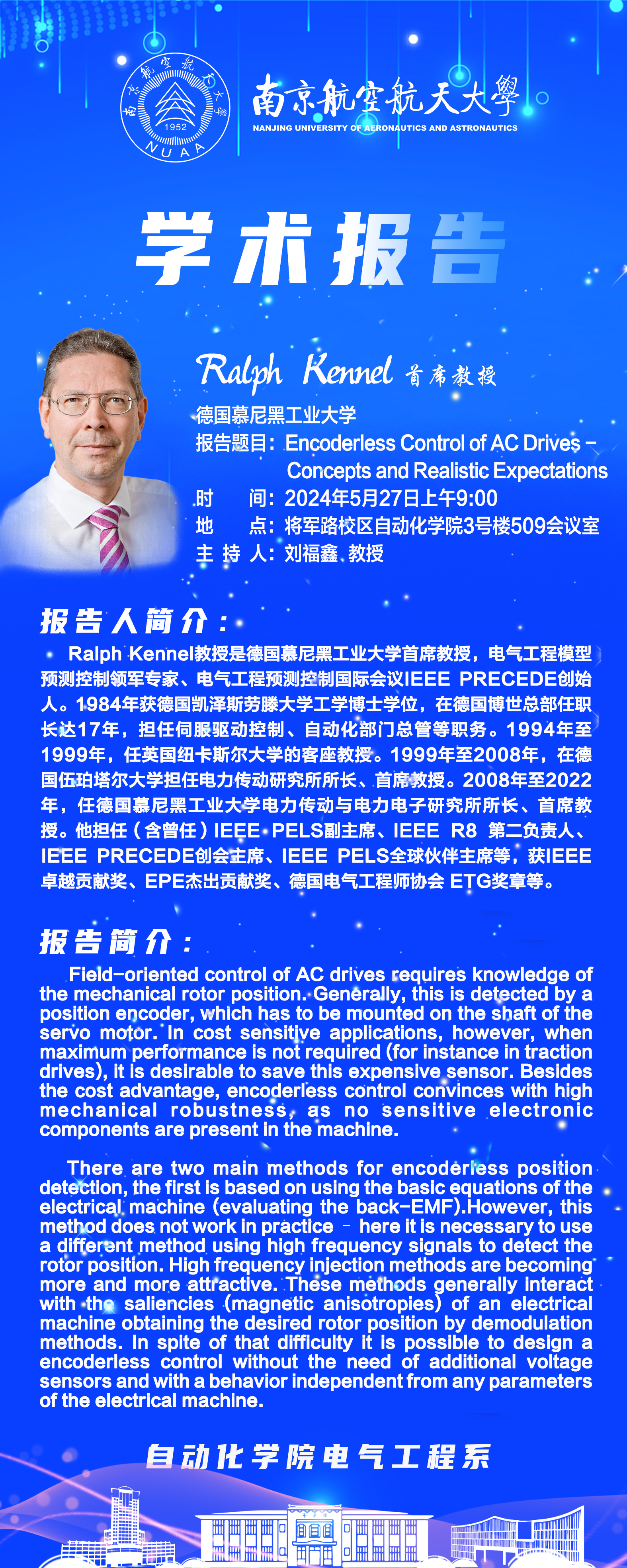 【学术报告】Ralph Kennel:Encoderless Control of Ac Drives Concepts and Realistic Expectations