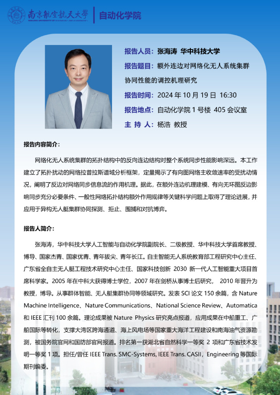 【学术报告】张海涛:额外连边对网络化无人系统集群协同性能的调控机理研究