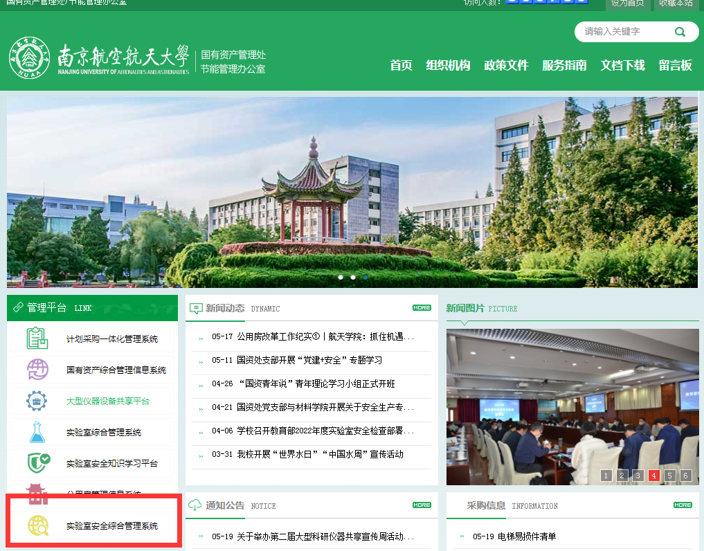 1.输入网址:gzc.milan-bet.com,访问国资处网站,点击“管理平台”栏目-“实验室安全综合管理系统”,采用校内统一身份认证的方式登录,具体操作如下图: