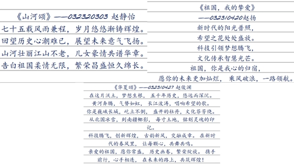 七十五载波澜壮阔,七十五载薪火相传。自动化学子用最热忱的青春笔触,献礼祖国母亲75周年华诞,书写对祖国母亲的浓浓情意。同学们通过诗歌创作,回顾祖国波澜壮阔的发展历程,讴歌新时代取得的辉煌成就,表达对祖国的热爱和祝福,厚植爱国主义情怀。