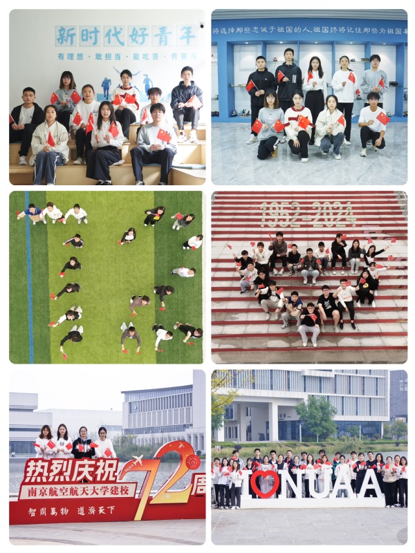 为传承红色基因,弘扬爱国精神,年级团总支组织部精心策划了“我与国旗合个影,我为祖国来点赞”活动。同学们手持小红旗,在校园寻找身边的国旗合影,用镜头记录下一幕幕正能量满满的瞬间,一个个朝气勃的面孔在国旗下定格和绽放。同学们创意迭出,巧妙构思,以数字“72”寓意学校辉煌历程,以心形排列象征拳拳赤子之心,以飞机队形样式彰显南航学子翱翔蓝天、矢志报国的壮志豪情,每一张合影都充满了青春的气息与爱国的热情,诉说对祖国母亲最美好的祝福。