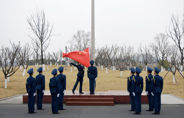 7时整,在晨曦的注目下,国旗班成员迈着坚定有力的步伐护送五星红旗入场。伴随着庄严的国歌,旗帜在晨曦中冉冉升起,全场师生肃立,行注目礼,奏唱国歌。