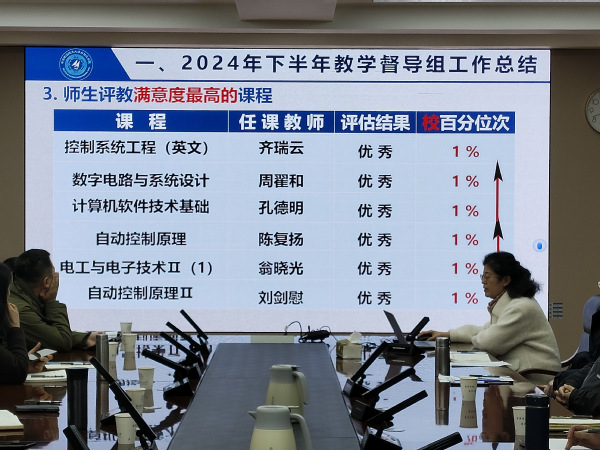 米兰体育 教学督导组组长邢丽冬教授总结了2024年下半年米兰体育 教学督导工作。她重点指出,与2023年相比,综合评估和学生评教优秀率显著提升,11位教师满意度达到全校1%,数量位列校前茅。会上也通报了学生评教满意度不高的课程并深入分析原因,提出了改进建议。邢丽冬对本科毕设归档材料的规范性提高表示肯定,也针对试卷管理和本科毕设环节中查到的细节问题给出了具体的整改建议。
