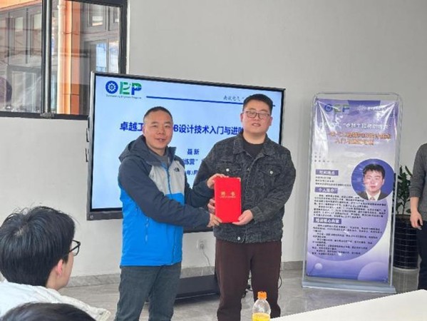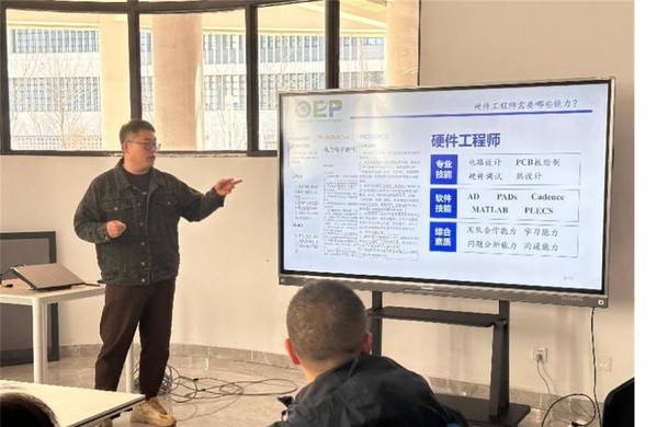 聂新工程师的培训聚焦于硬件工程师的核心技能:PCB设计,培训围绕PCB设计的全流程展开,从概念设计到成品制造,详细讲解常见问题及应对策略。同学们被电磁干扰的抑制、信号完整性的保障、热设计的优化及装配问题的解决等的实例介绍深深吸引,规范的设计与实践相结合的有效方法,对同学们培养高效的设计能力给与了很好的指导。现场指导环节,与同学们绘制的大创项目相关PCB进行一对一辅导,使得同学们快速提升了设计能力,并可以很快在实践中得到检验。