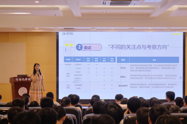 王秋楠以《来自企业视角的就业指导》为主题,围绕“就业准备”“简历设计”与“面试技巧”三大模块展开讲解。结合科大讯飞的校园招聘案例,深入分析了当前就业市场形势。她指出,2026届毕业生规模再创新高,各类学历层次毕业生的就业竞争将更为激烈,提醒同学们既要锚定职业方向,更需主动认清行业趋势与竞争环境,提前做好充分准备。